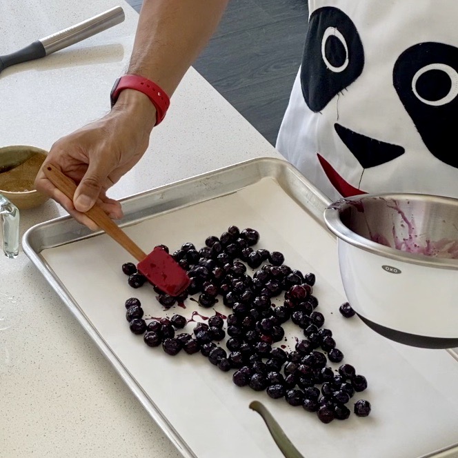 - Line a rimmed baking sheet with parchment paper. In a small bowl whisk together maple syrup and sea salt. Toss together with blueberries. Arrange the berries in a single layer and roast for 30 minutes with the olive oil cake.
