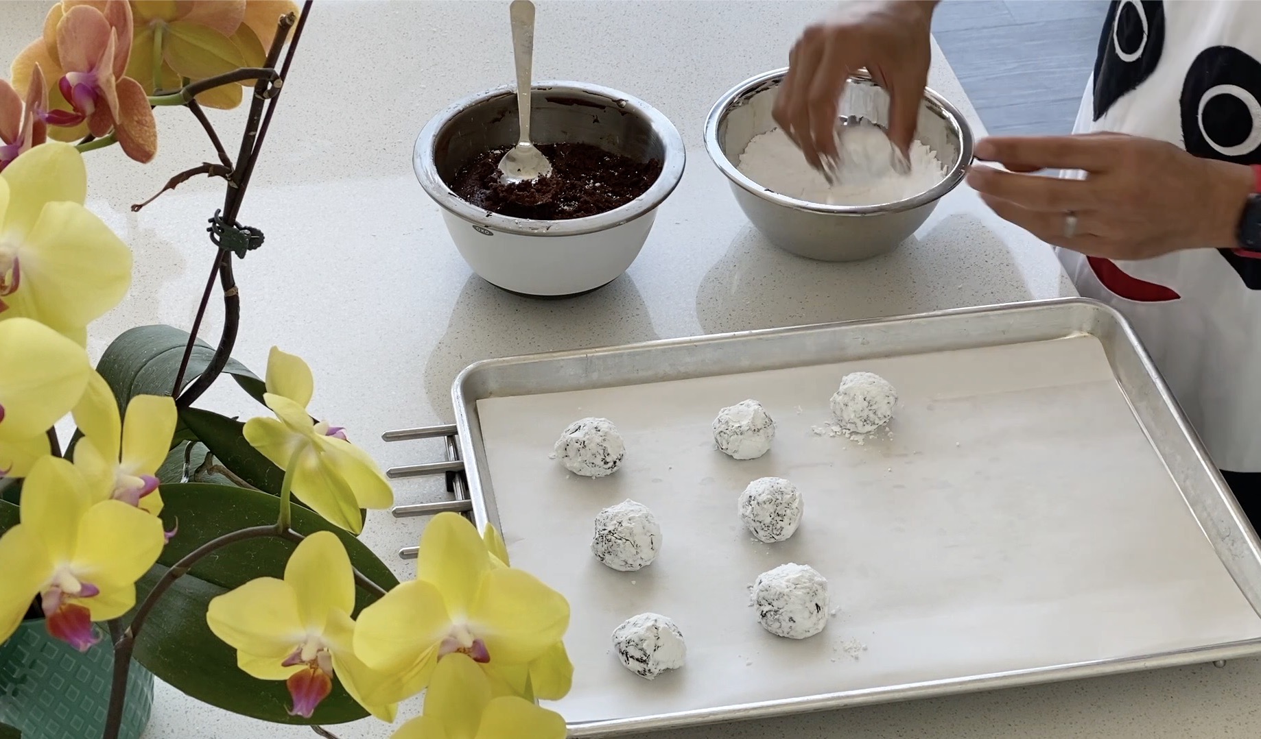 Put the powdered sugar on a plate or in a bowl. Spoon out a portion of the chilled dough and roll them into balls and then coat them by rolling around in the powdered sugar. Place on cookie sheet.
