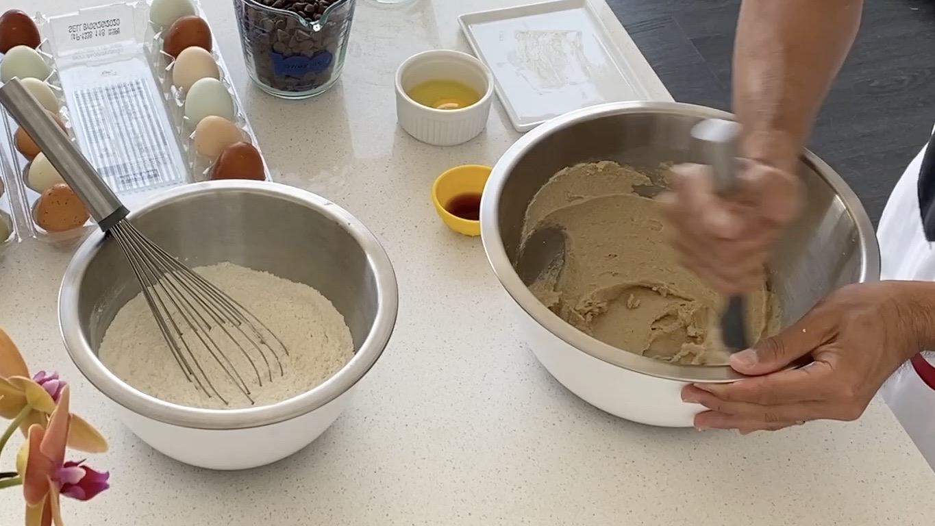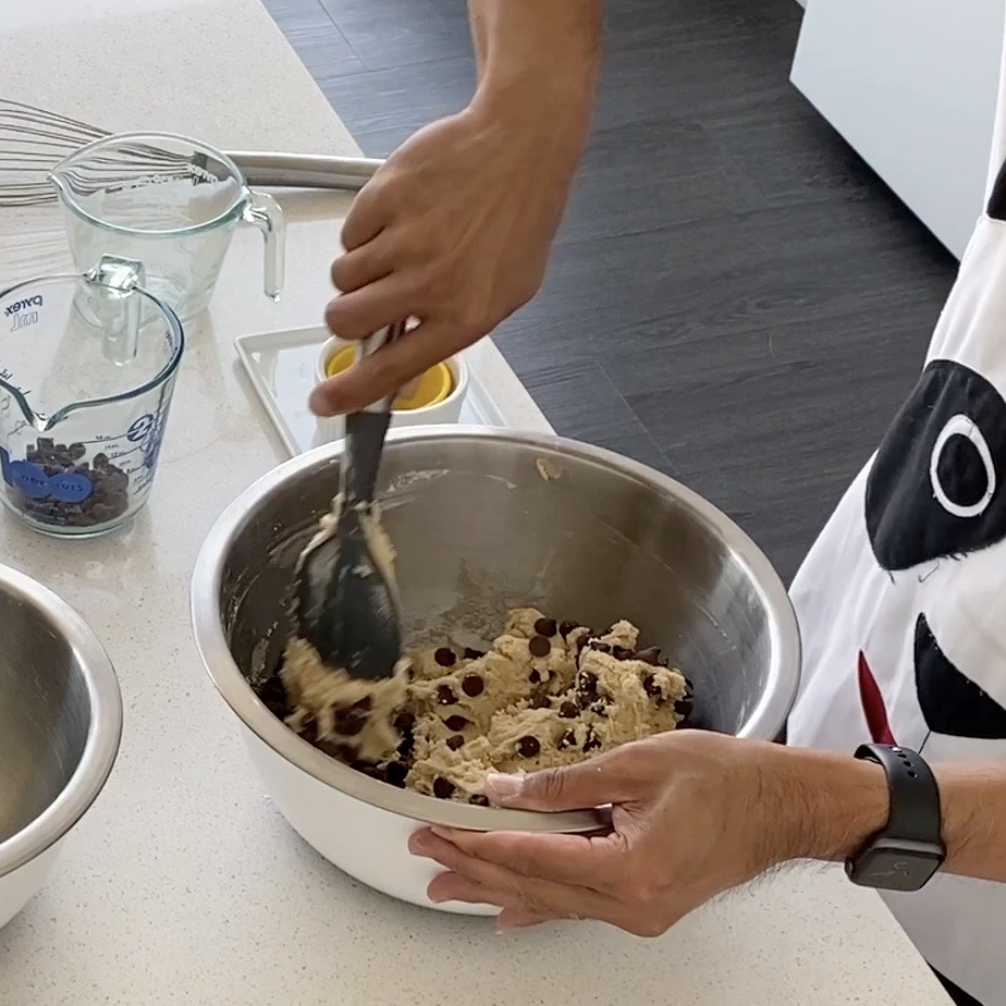 3. Slowly add the flour mixture and beat until just incorporated. With a spatula, mix in the chocolate chips. Cover the bowl and chill for 15-30 minutes.