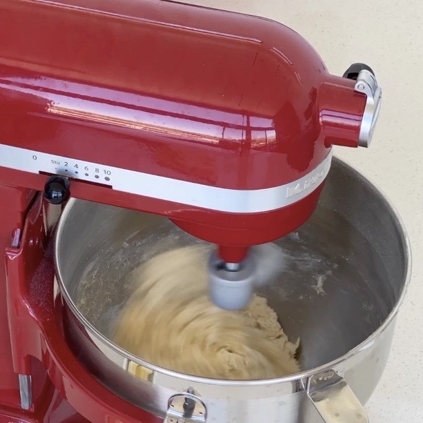 Add eggs and starter and use a dough hook on low speed (2 on Kitchen Aid) and knead 5 minutes until the dough starts to form a nice ball.