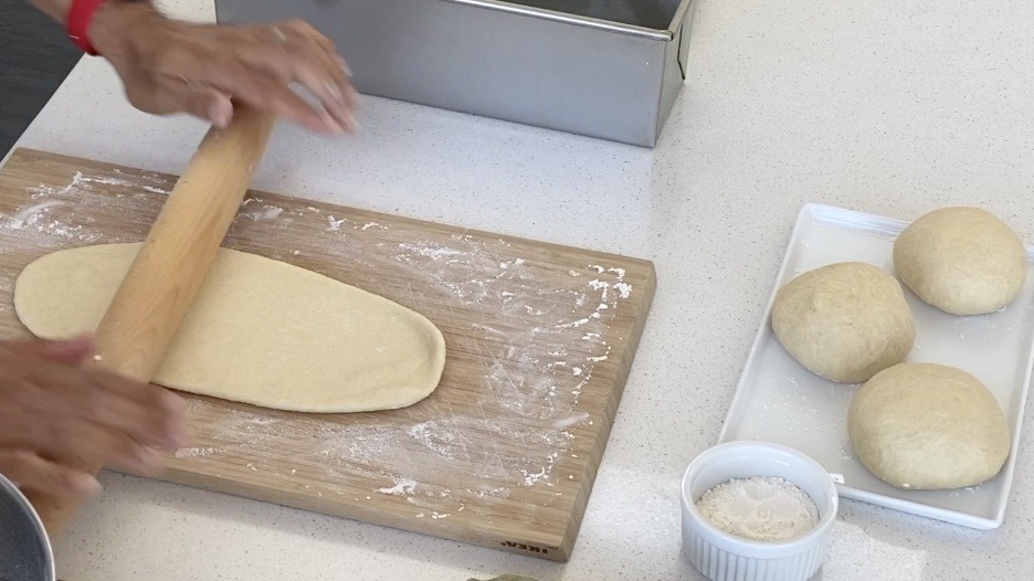 Generously grease a 1.5 lb Pullman loaf pan. Using a rolling pin, gently roll out one dough ball into an oval about 12 inches long and 6 inches across.